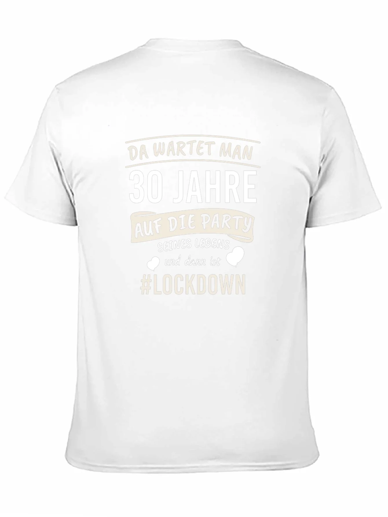 Celebrate a milestone birthday with a touch of humor in this black graphic tee. The shirt features a playful white print that reads "Da wartet man 30 Jahre auf die Party seines Lebens und dann ist #LOCKDOWN", perfect for anyone who had their 30th birthday plans foiled. Made from a comfortable-looking fabric, this short-sleeved tee is ideal for casual wear, virtual parties, or as a fun gift. Show off your sense of humor and embrace the current situation with this unique birthday shirt.