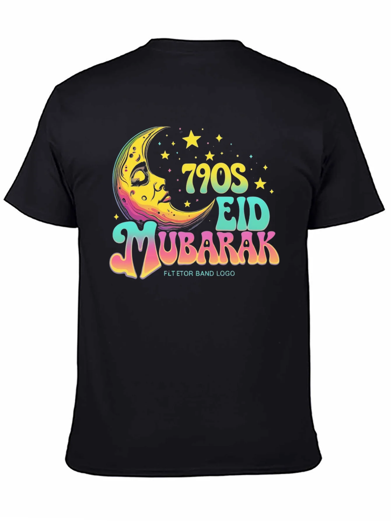 Celebrate Eid in style with this unique black T-shirt! Featuring a vibrant, retro-inspired design with a crescent moon, stars, and the words "790s Eid Mubarak," this tee is perfect for festive occasions. The design's nostalgic vibe makes it a standout piece. Made from comfortable fabric, it's ideal for everyday wear or special gatherings. Show off your festive spirit and retro style. This tee is a must-have for your Eid wardrobe!