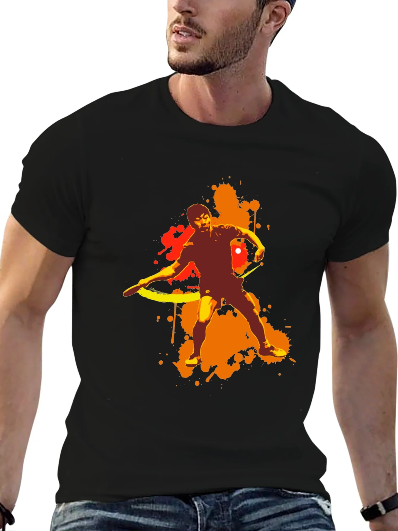 Showcase your love for table tennis with this stylish black t-shirt. The shirt features an abstract graphic of a table tennis player in action, rendered in bold shades of orange and red. The design incorporates a unique splash effect, giving it a modern and artistic edge. Made from a comfortable-looking fabric, this t-shirt is perfect for casual wear, sports events, or simply expressing your passion for the sport. Pair it with jeans or shorts for a relaxed and sporty look. This eye-catching design is sure to turn heads and spark conversations.