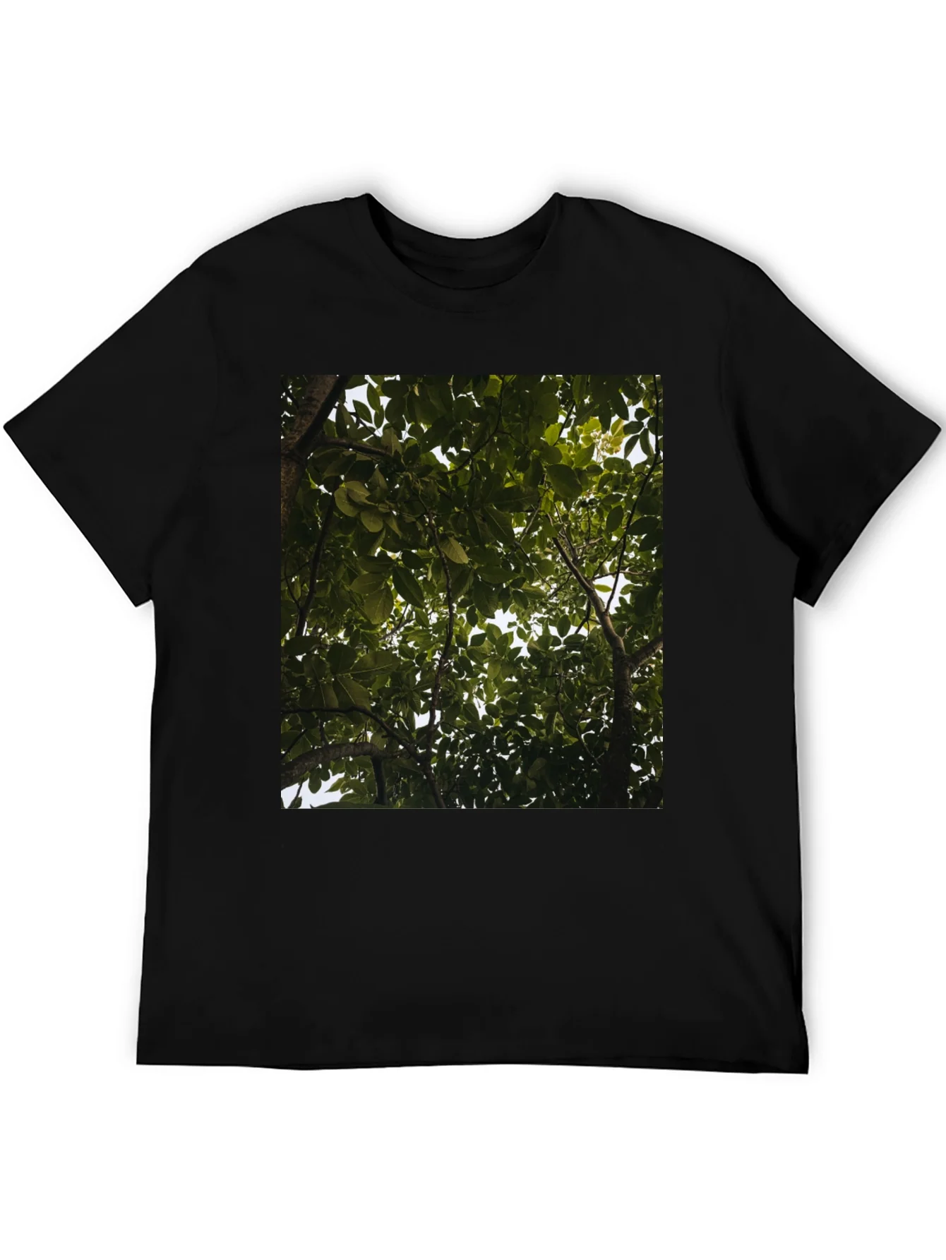Embrace nature with this unique graphic tee. This black t-shirt features a captivating square design of a lush tree canopy. The image is a view looking up through dense green leaves and tree branches against a bright sky, offering a refreshing and calming aesthetic. Perfect for nature lovers, casual outings, or anyone looking to add an artistic touch to their wardrobe. Made from a soft, comfortable fabric blend, this tee ensures all-day wearability. Stand out with this arboreal statement piece!