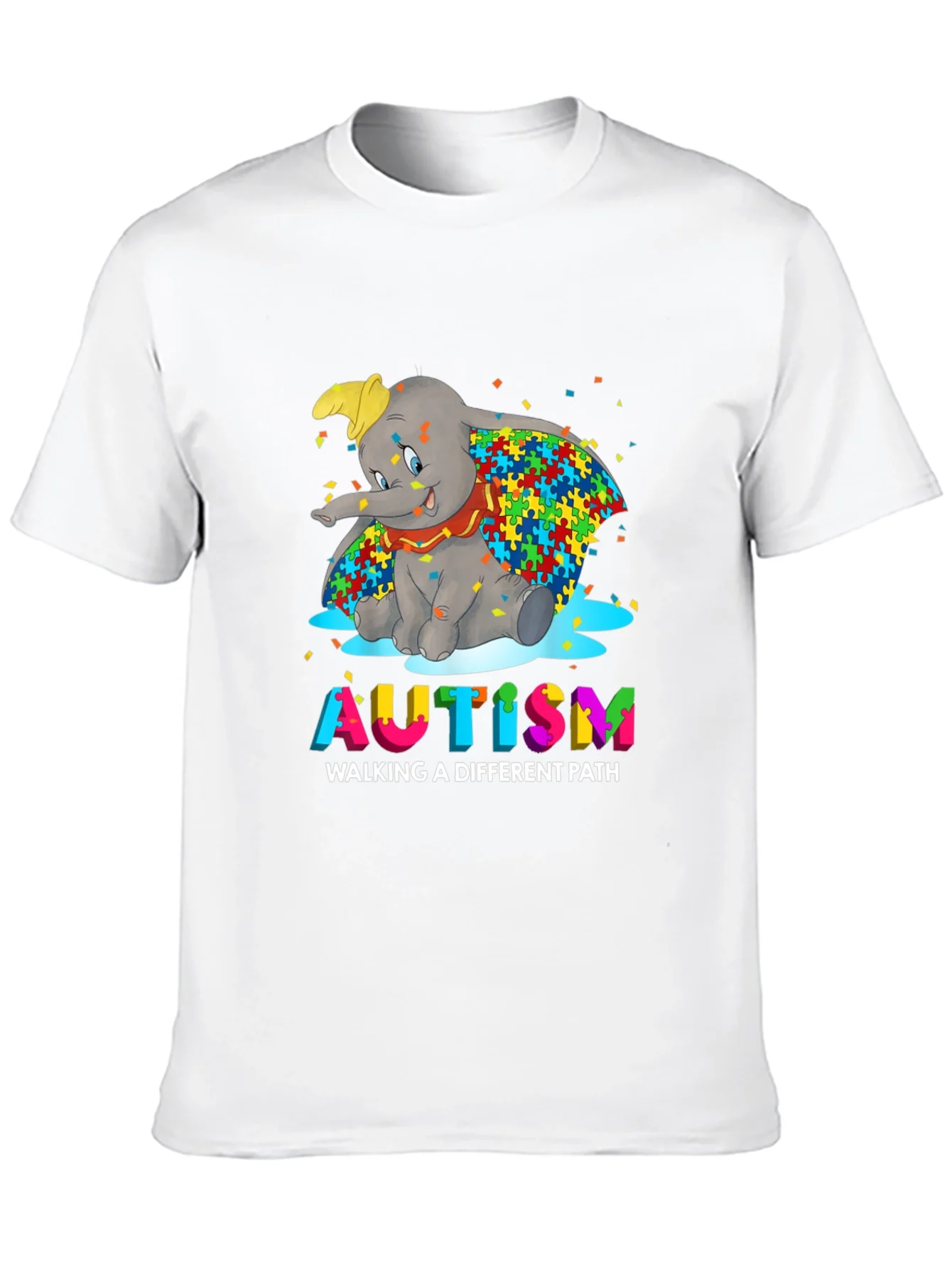 Show your support with this unique black T-shirt featuring Dumbo with a colorful autism puzzle piece design. The vibrant graphic includes the word "AUTISM" in rainbow lettering above the saying "WALKING A DIFFERENT PATH." Made from comfortable fabric, this tee is perfect for autism awareness events, casual wear, or as a thoughtful gift. The playful design and meaningful message make this shirt a great way to promote understanding and acceptance.