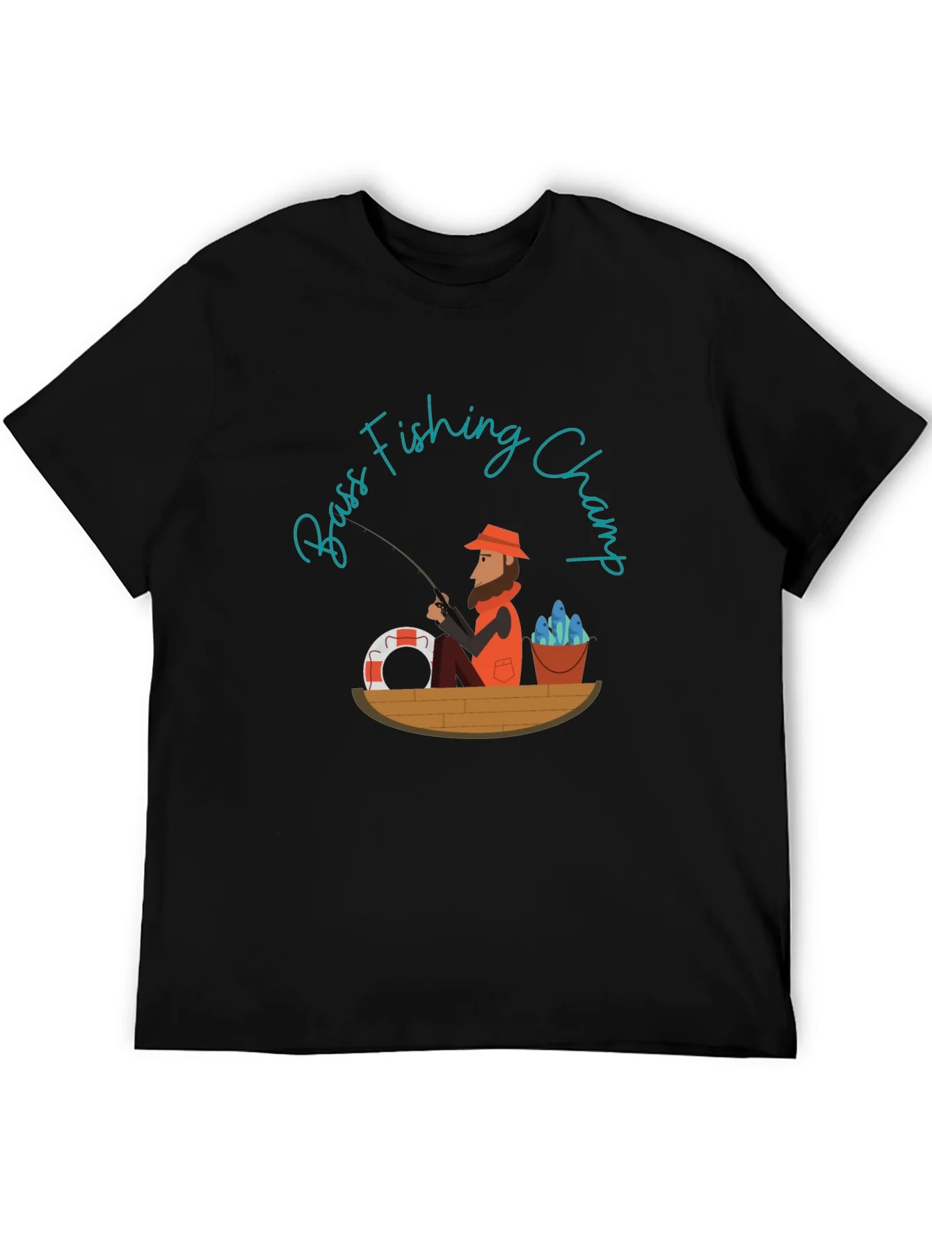 Show off your love for fishing with this unique graphic tee! This black t-shirt features a vibrant design of a fisherman in a boat, complete with a bucket of fish and a life preserver. The phrase "Bass Fishing Champ" artfully frames the illustration in a stylish script. Made from a comfortable-looking fabric, this shirt is perfect for casual wear, fishing trips, or as a gift for the avid angler. Get yours today and celebrate your passion for fishing in style!