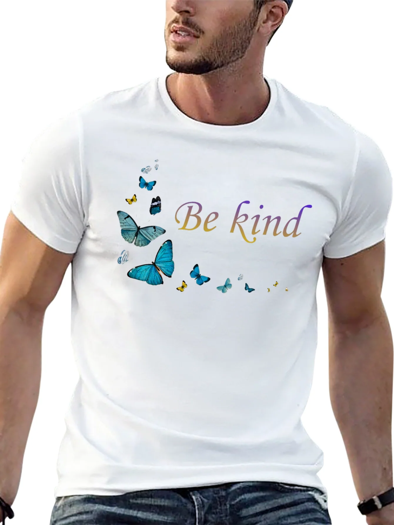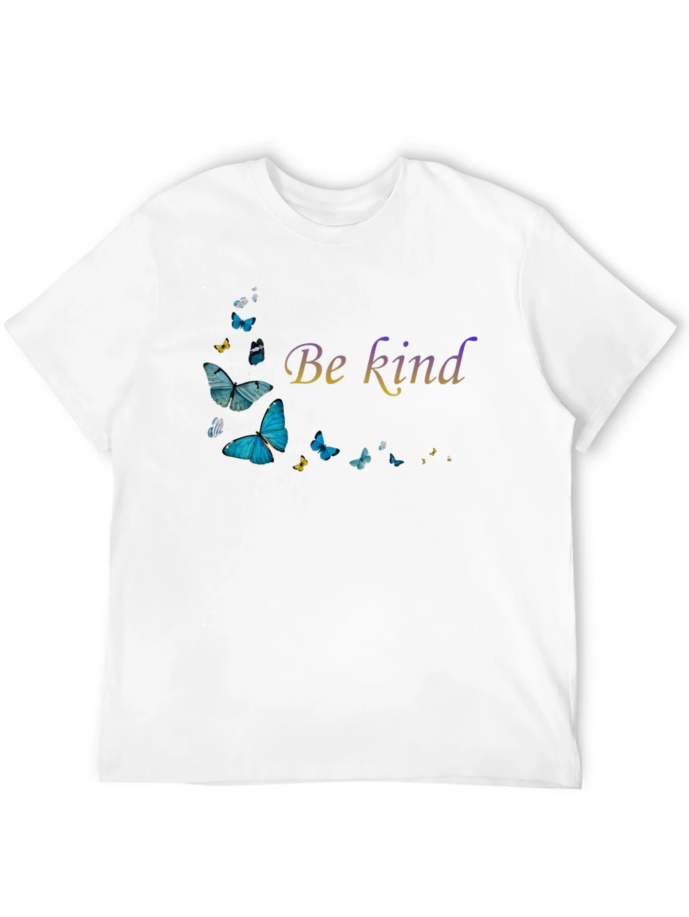 This stylish black t-shirt features a beautiful "Be Kind" graphic with a collection of butterflies. The graphic is artistically arranged on the front, adding a touch of whimsy and positivity to your wardrobe. Made from comfortable fabric, this t-shirt offers a relaxed fit that's perfect for everyday wear. The black background makes the butterfly design stand out, making it a versatile piece that can be paired with jeans, shorts, or a skirt for a casual and chic look. Show off your kind side in this must-have t-shirt!