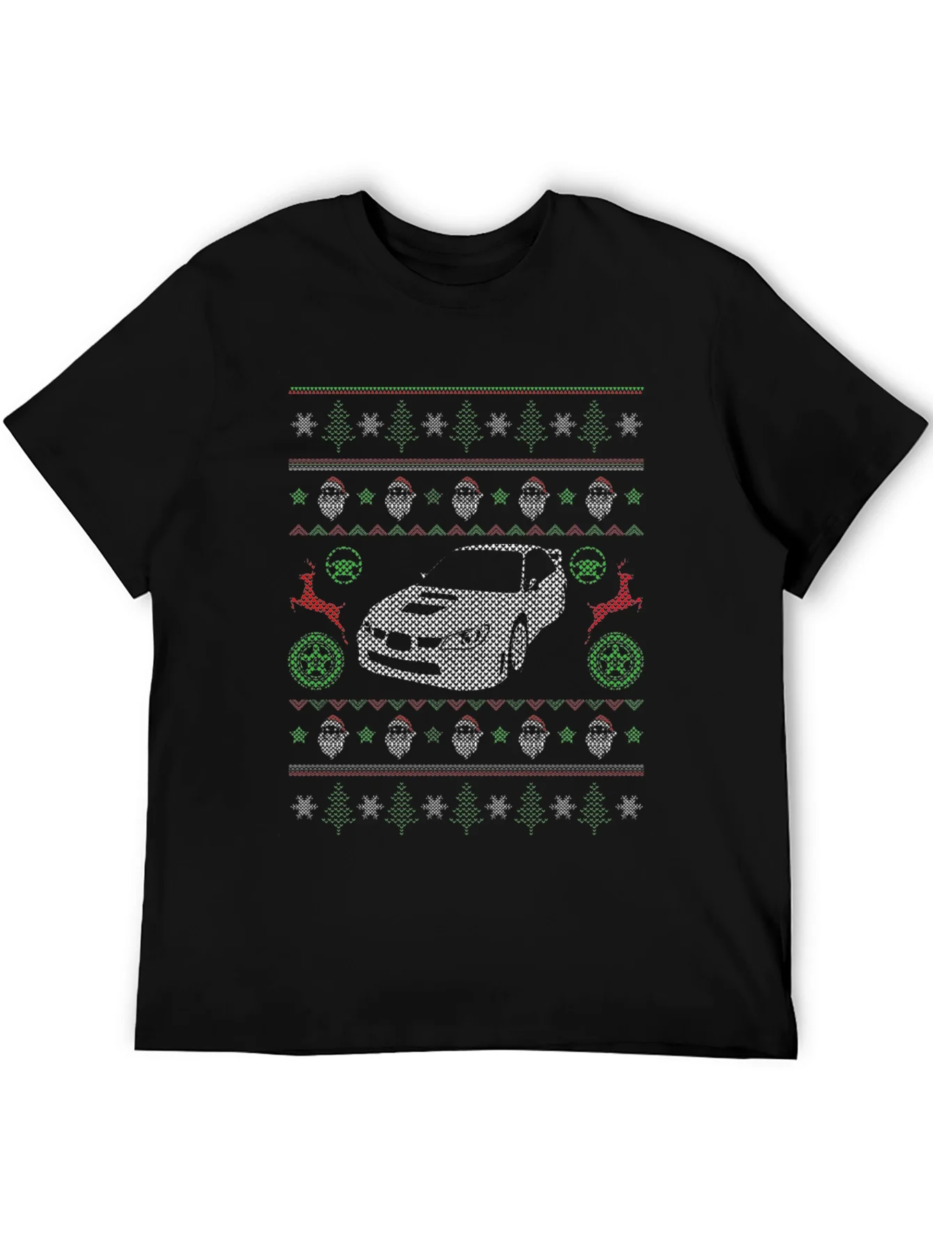 Get into the holiday spirit with this fun and festive men's t-shirt! Featuring a black background, this shirt showcases a novelty "ugly sweater" style design with a white race car. Reindeers, Christmas trees and Santa faces add charm. The design has a pixelated, knit-like appearance, giving it a cozy, humorous feel. Perfect for casual holiday gatherings, parties, or just spreading some Christmas cheer. This t-shirt is a unique and comfortable way to celebrate the season with a touch of automotive flair. The shirt appears to be made of a soft, breathable material for all-day comfort.