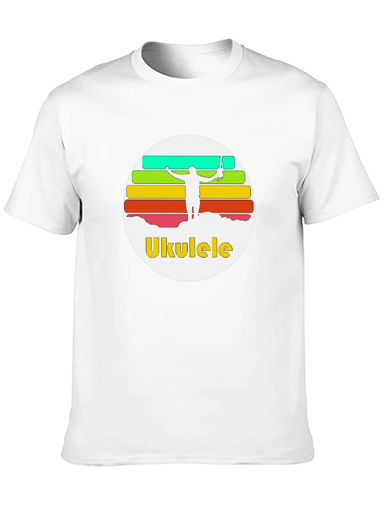 Rock a retro vibe with this black Ukulele T-shirt. Featuring a sunset-inspired design with colorful horizontal stripes and a ukulele player silhouette, this tee brings a laid-back musical feel to any outfit. The word "Ukulele" is written below in a stylish, golden font. Perfect for casual wear, concerts, or ukulele enthusiasts. Wear it at the beach, to a jam session, or while relaxing at home. This comfortable shirt will add a touch of vintage cool to your wardrobe.