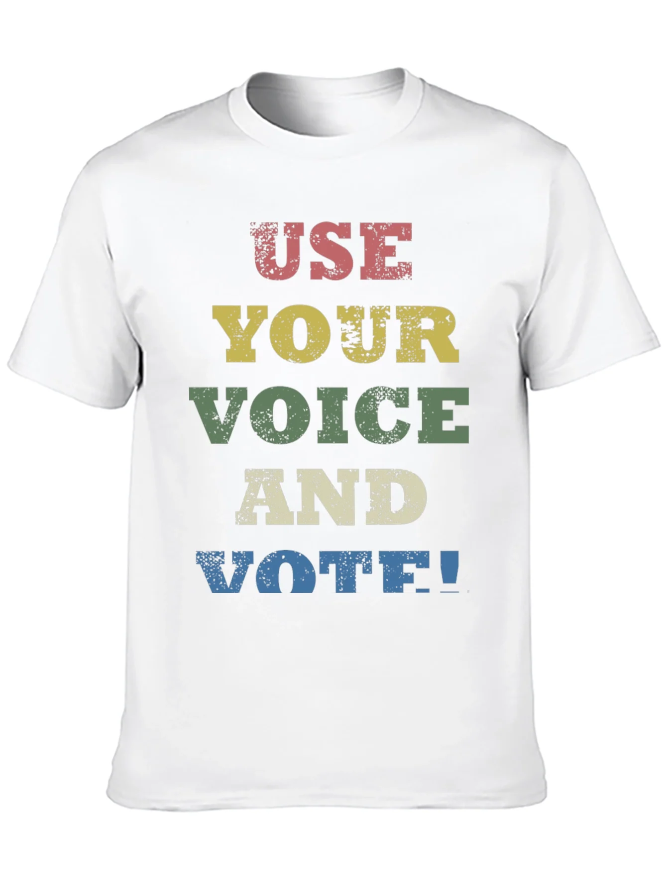 Make a statement with this stylish black t-shirt! Featuring the empowering message 'USE YOUR VOICE AND VOTE!' in a stacked, multi-colored design, this tee is sure to turn heads. The distressed retro font gives it a cool, vintage vibe. Perfect for rallies, elections, or everyday wear, this shirt is a great way to encourage civic engagement. Made from a comfortable fabric, it's designed for all-day wear and is bound to become a wardrobe staple. Show your passion and inspire others to vote with this unique and eye-catching t-shirt.