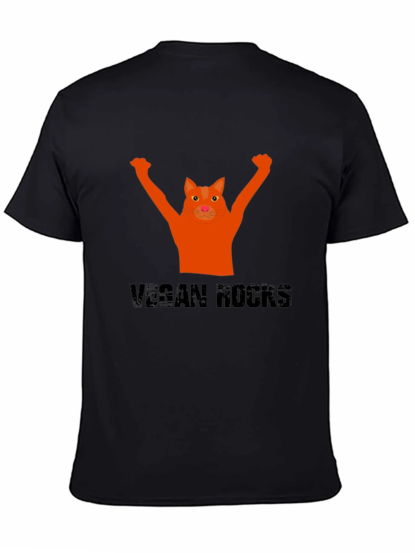 Show your love for animals and veganism with this unique graphic t-shirt. The shirt features an orange cat raising its arms in a celebratory gesture above the phrase 'VEGAN ROCKS'. The design is prominently displayed on the front of the black, short-sleeved t-shirt. Made from what appears to be a soft, comfortable fabric, this tee offers both style and comfort. Perfect for casual wear, vegan festivals, or as a statement piece, this t-shirt is a great way to express your values and spark conversations. Get yours today and let the world know that veganism rocks!