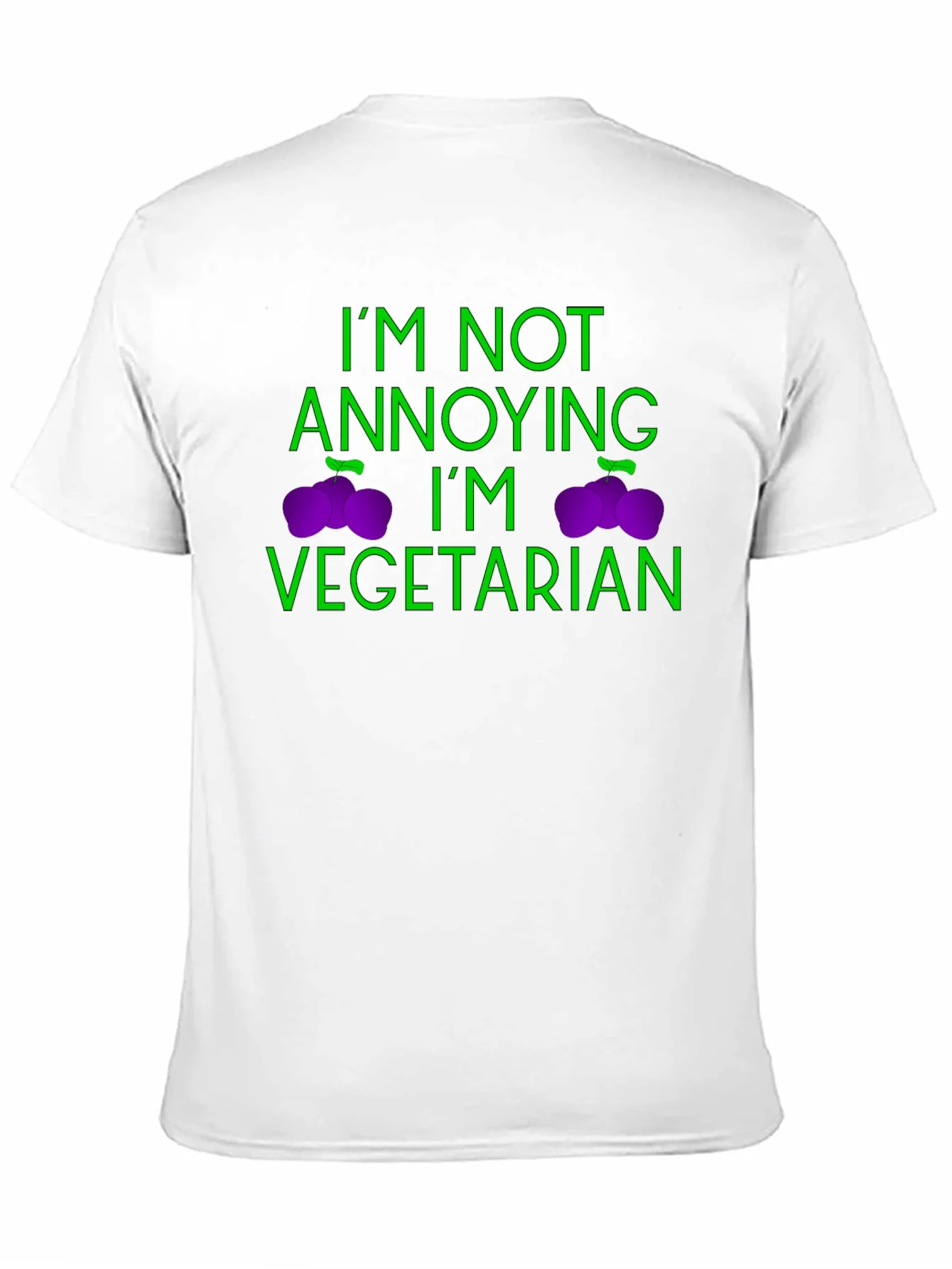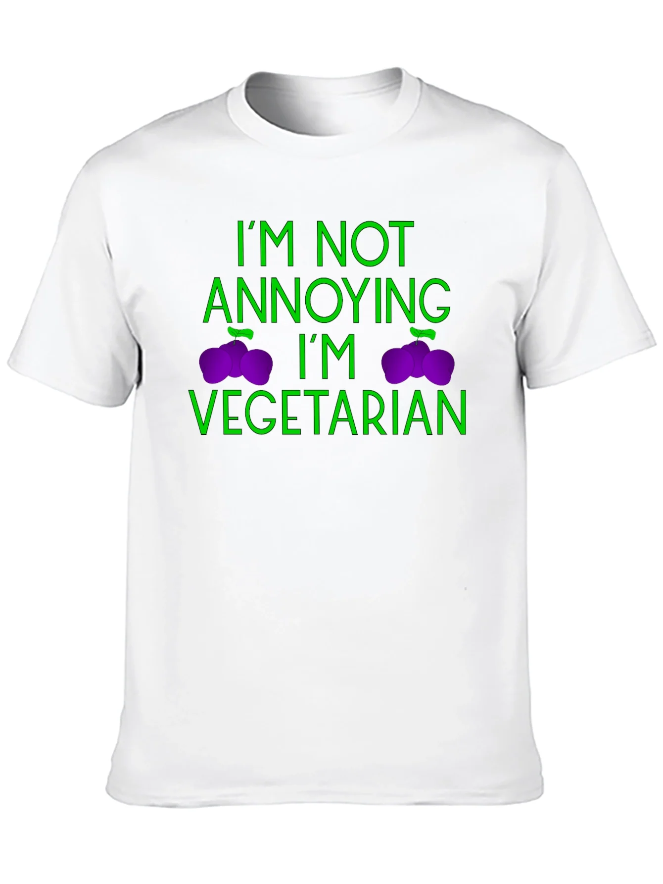 Showcase your lifestyle with this bold black tee! This unique t-shirt features the phrase "I'M NOT ANNOYING I'M VEGETARIAN" in a striking green font, playfully complemented by purple fruit graphics. Made from comfortable, breathable material, this shirt is perfect for everyday wear. Whether you're hitting the gym, grabbing coffee, or attending a casual gathering, this tee is a great conversation starter. Its relaxed fit ensures all-day comfort, while the eye-catching design lets you express your individuality. A must-have for vegetarians with a sense of humor!