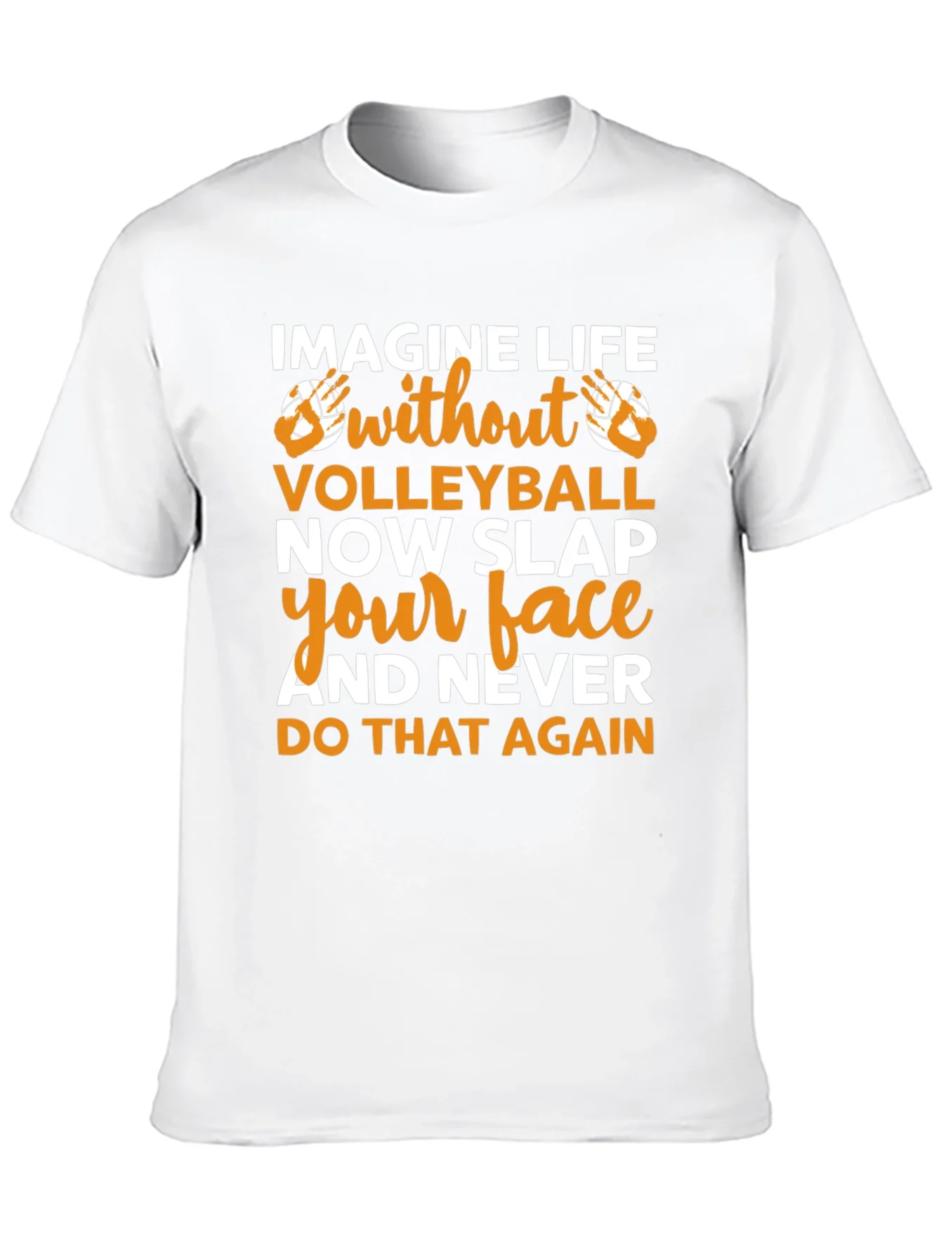 Show your love for volleyball with this unique black t-shirt! Featuring a playful graphic design, the shirt reads "Imagine Life without Volleyball. Now slap your face and never do that again." The design incorporates volleyballs for visual appeal. Made from a comfortable, breathable fabric, this tee is perfect for casual wear, volleyball practices, or showing off your passion for the sport. It's an ideal gift for volleyball players, coaches, and fans. Get yours today and let everyone know how much you love volleyball!