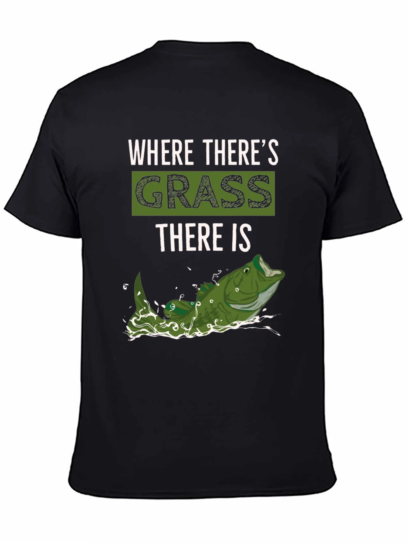 This eye-catching black t-shirt features a witty slogan, "Where There's Grass, There Is..." accompanied by a vibrant graphic of a bass leaping out of the water. The word "GRASS" is highlighted in green within a rectangular box, creating a visually appealing contrast. Made from what appears to be soft, comfortable cotton or a cotton blend, this tee looks great and feels comfortable. The playful design suggests a love for fishing and the outdoors, making it an ideal choice for anglers or anyone with a fun sense of humor. Perfect for casual wear, fishing trips, or as a unique gift for the fishing enthusiast in your life. Get yours today and show off your passion for the great outdoors!