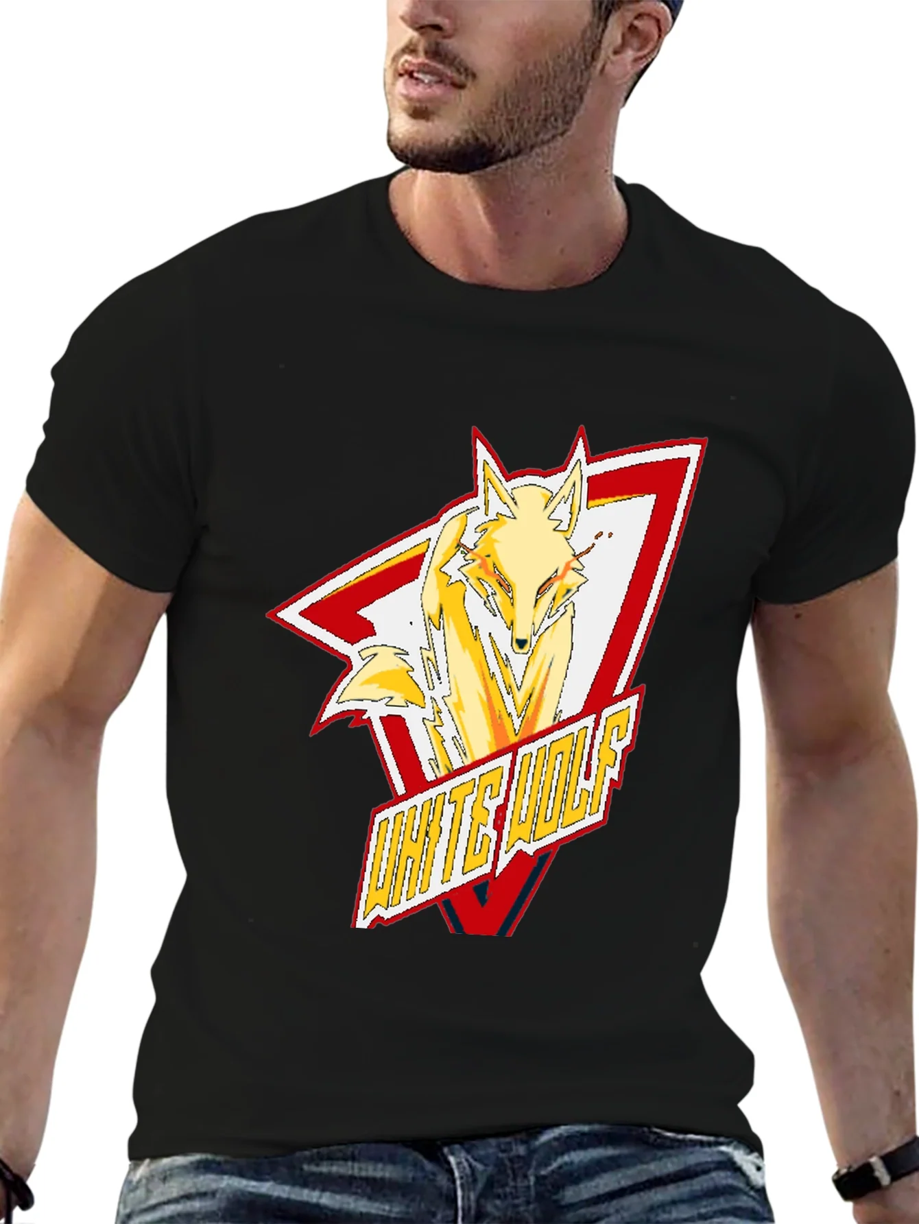 Show off your wild side with this striking black t-shirt. Featuring a bold "White Wolf" graphic, it combines modern style with eye-catching design. The graphic incorporates a stylized wolf within a red and white triangular frame, making a powerful statement. Crafted from comfortable fabric, this tee is ideal for casual wear, concerts, or adding an edge to your everyday look. Express your unique personality and stand out from the crowd with this must-have wardrobe staple. Get yours today and embrace your inner wolf!
