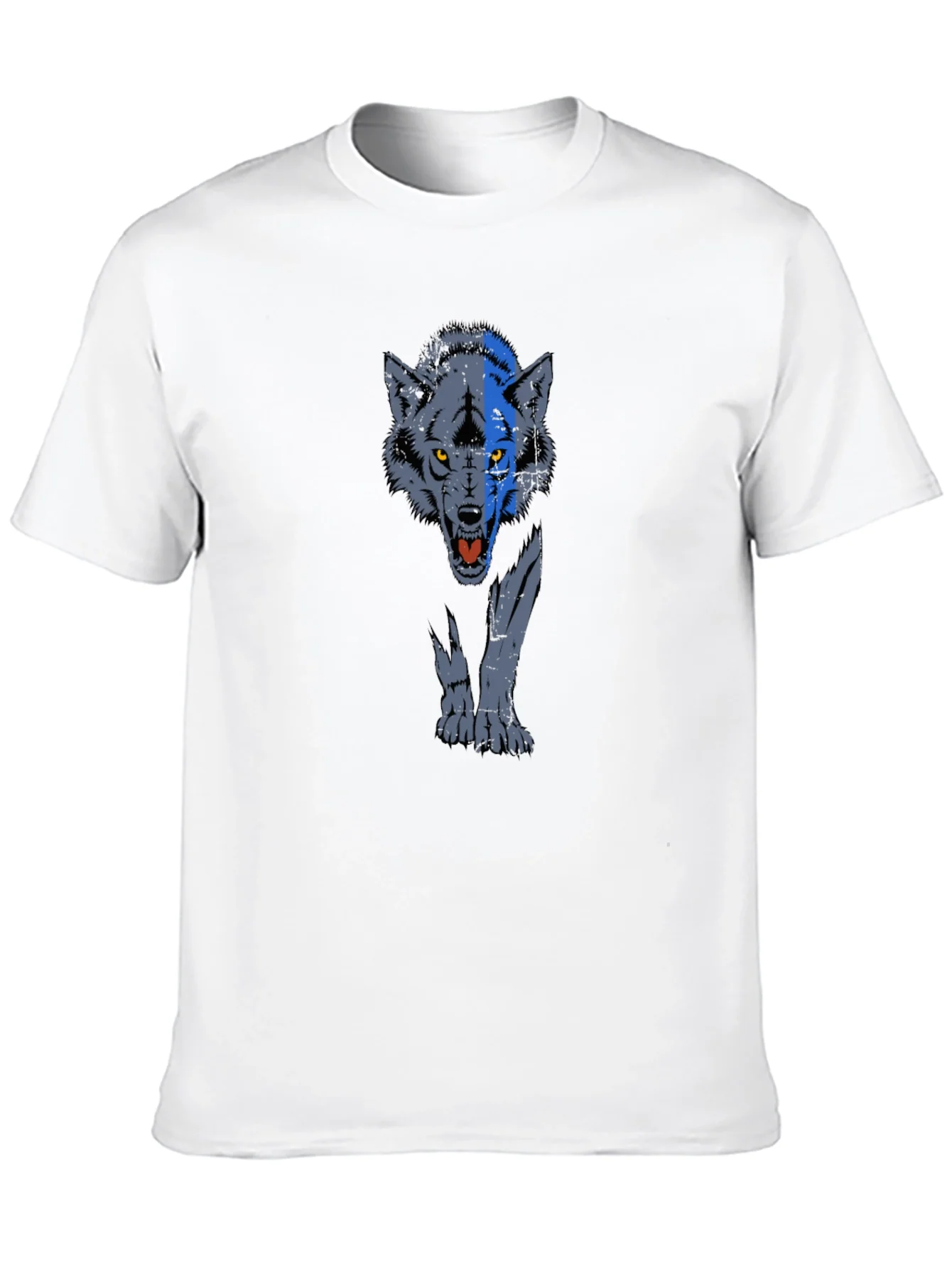 Unleash your inner beast with this striking black T-shirt! Featuring a bold graphic print of a menacing wolf with piercing yellow eyes, this tee is sure to turn heads. The detailed design showcases a blue and gray wolf emerging forward, complete with its teeth bared for a cool and edgy look. Made from comfortable and breathable fabric, this short-sleeve shirt is perfect for casual wear, concerts, or expressing your unique style. Pair it with jeans or shorts for an effortlessly cool ensemble. This fierce wolf graphic T-shirt is a must-have addition to any wardrobe, perfect for those who want to make a statement.