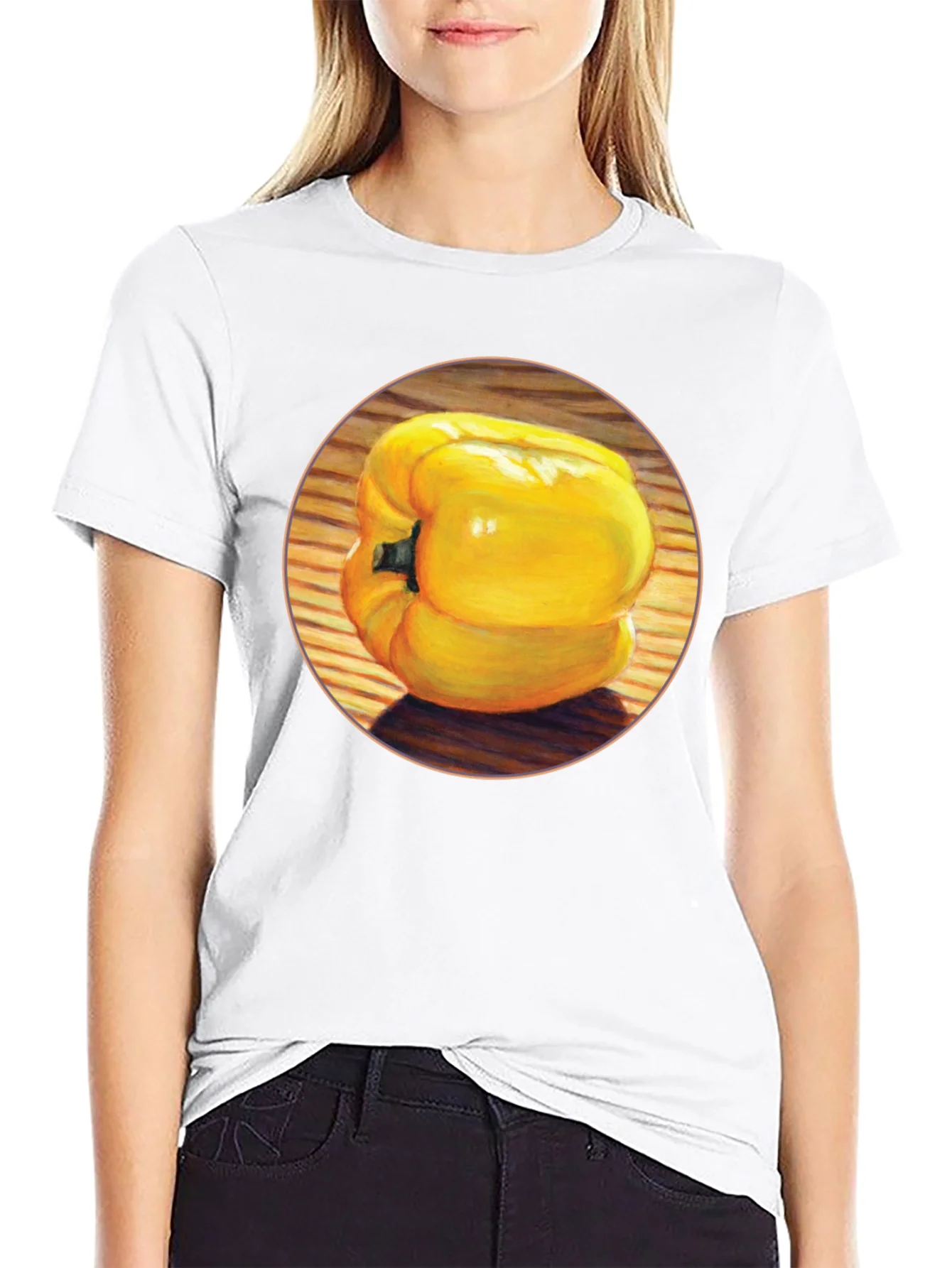 Show your love for fresh produce with this unique graphic tee! This black, unisex t-shirt features a vibrant, artistic rendering of a yellow bell pepper. The design is eye-catching and adds a pop of color to your wardrobe. Made from a soft, comfortable fabric, this t-shirt is perfect for everyday wear. Whether you're a gardener, a foodie, or just appreciate a fun and quirky design, this pepper tee is sure to be a hit. It's ideal for casual outings, farmers markets, or relaxing at home. Get yours today and add some zest to your style!