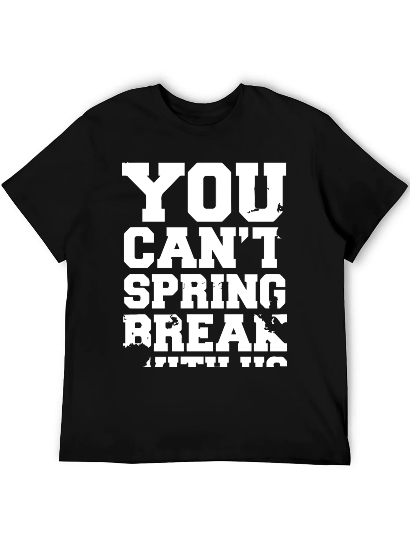 This black T-shirt features a bold white graphic print that humorously declares "YOU CAN'T SPRING BREAK WITH US." Made from what appears to be a comfortable cotton blend, the shirt offers a relaxed fit, making it ideal for casual wear. The distressed-style font adds a touch of vintage appeal. Whether you're prepping for a party or just looking to make a statement, this T-shirt is sure to turn heads and spark conversation. Perfect for spring break, vacations, parties, or just everyday wear, express yourself with this unique tee!