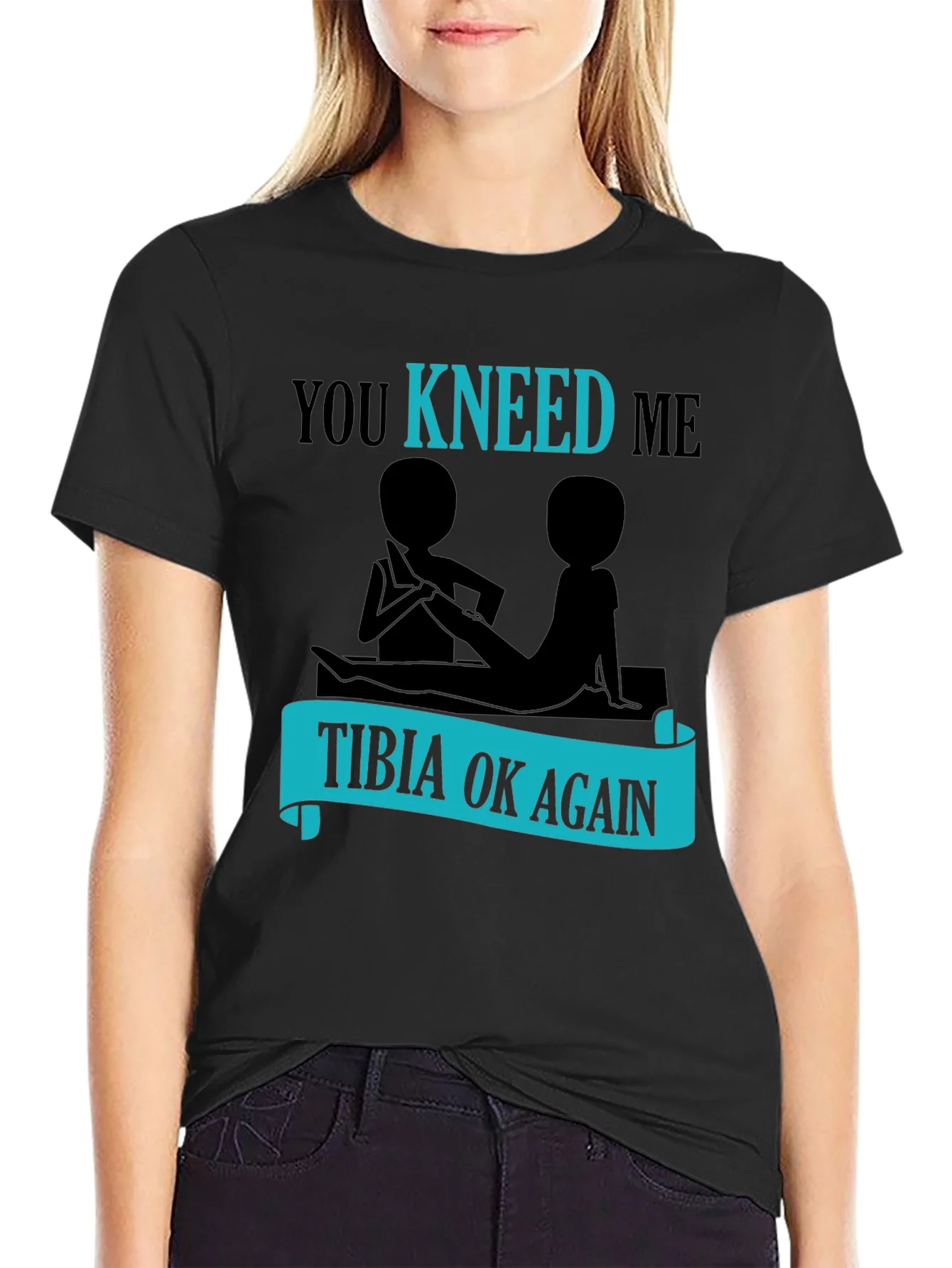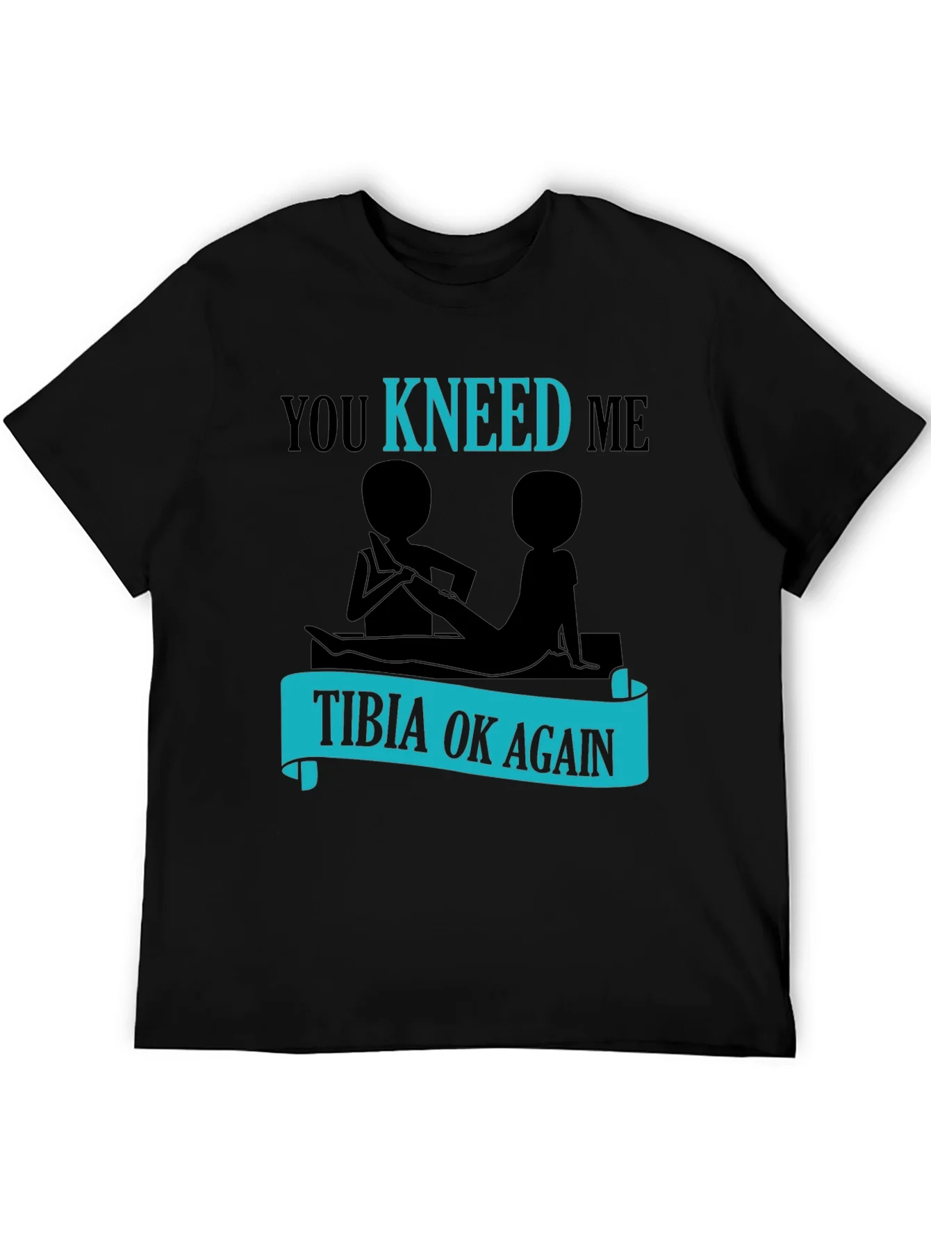 This black t-shirt features a humorous graphic design related to physical therapy. The design includes the playful phrase "You Kneed Me" with the word "KNEED" highlighted in a bright blue color. Below this is a graphic depicting two stick figures in a massage situation. Underneath the figures is a blue banner that reads "TIBIA OK AGAIN." This shirt is perfect for physical therapists, massage therapists, or anyone who appreciates a good pun! It is made of a comfortable-looking fabric, ideal for casual wear. A great conversation starter!