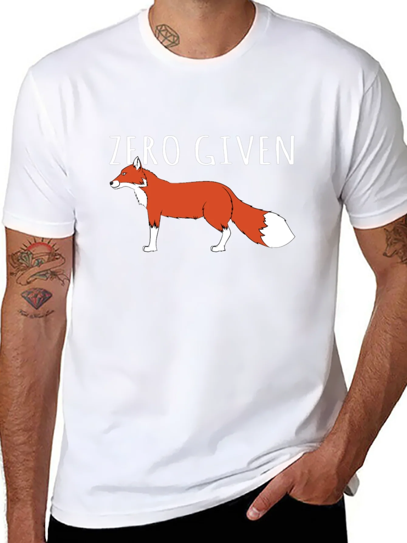 Show off your playful side with this men's black t-shirt featuring a bold "Zero Given" graphic with a sly fox illustration. The shirt is made from what appears to be comfortable, breathable cotton blend fabric and has a classic crew neck and short sleeves for a casual, relaxed fit. Perfect for everyday wear, this tee is sure to spark conversations and add a touch of humor to your wardrobe. Wear it on casual Fridays, weekend outings, or just lounging around at home. Express your unique personality with this eye-catching tee!